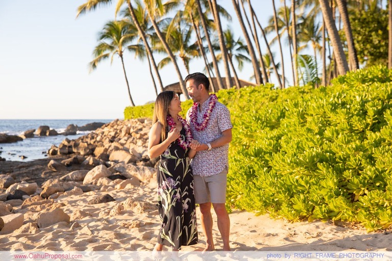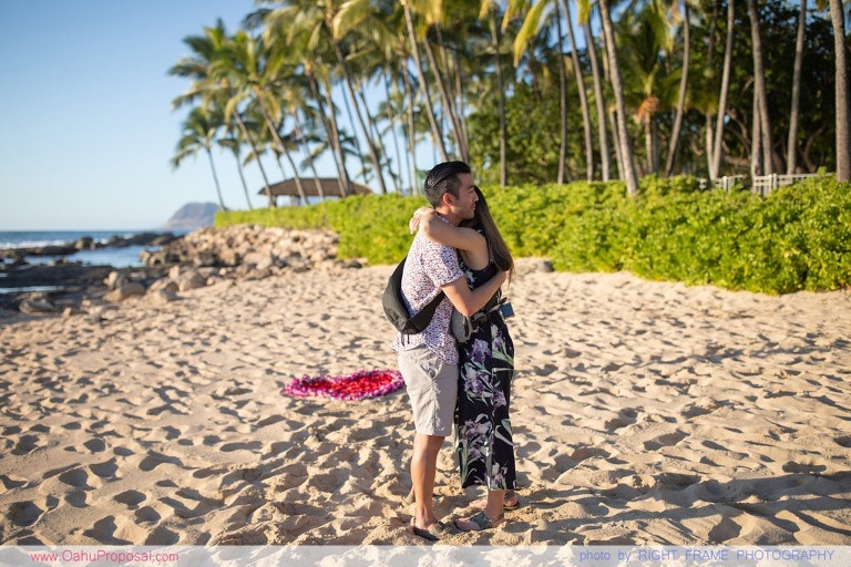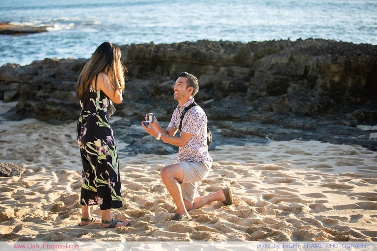 Sunset surprise proposal at Secret Beach, Ko Olina, Oahu (near Four Seasons Resort). Photographed by Honolulu Proposal Photographer – Right Frame Photography