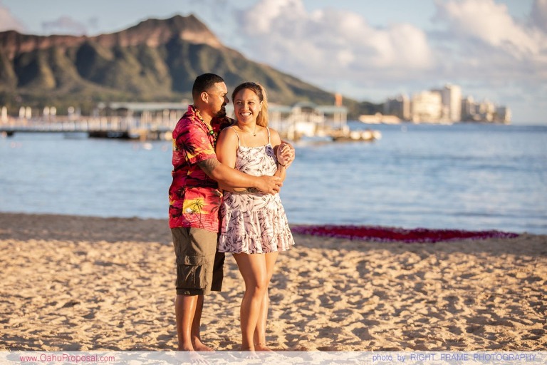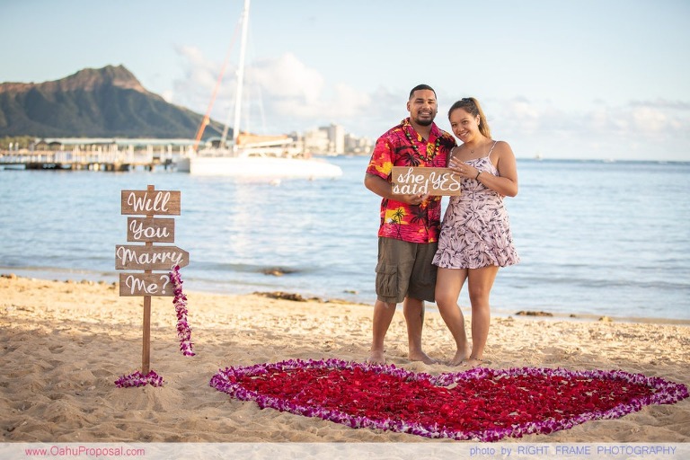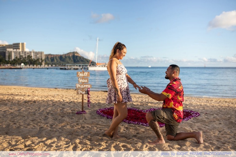 Surprise proposal at Waikiki Beach near Hale Koa Hotel, with a rose petals heart in the sand. Photographed by Oahu Proposal Photography – Right Frame Photography
